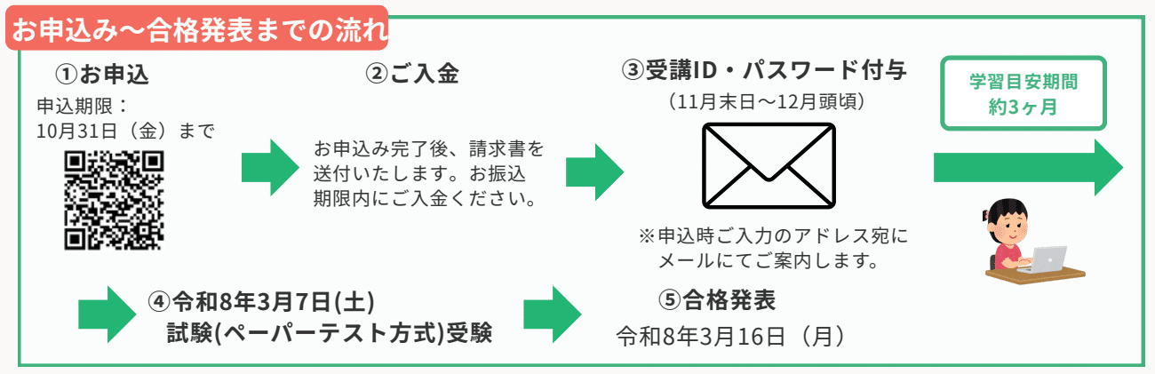 ・令和8年3月7日(土)試験(ペーパーテスト方式)をご受験いただくこと。 ・申込期限までにお申し込みいただくこと。 ・検定試験の受験料を振込期限内にお振込みいただくこと。 |