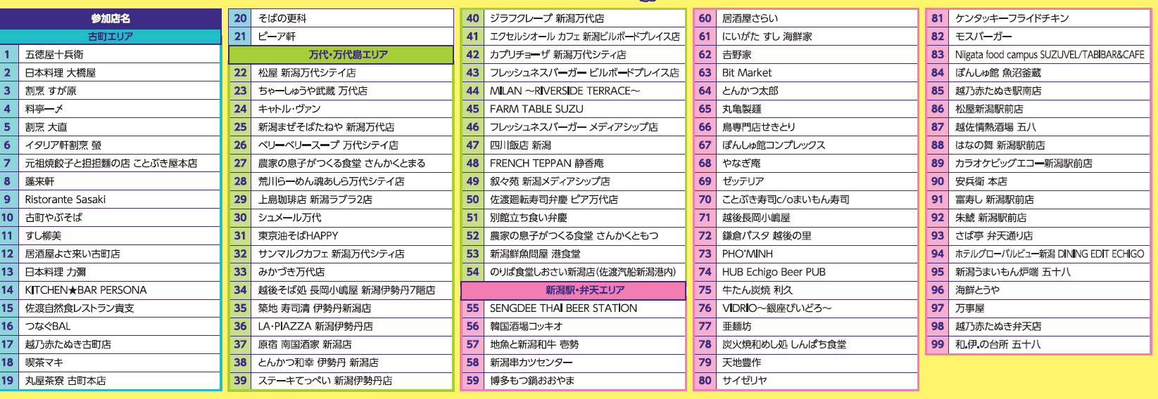 期間中に3つのエリアの飲食店を楽しみながら巡り、応募シールを集めて「トキエア往復航空券『新潟~札幌(丘珠)便』または『新潟~神戸便』」や「料亭お食事&芸妓鑑賞ペア券」、「CoCoLo新潟お買物券」、「万代シテイ共通お買い物券」等の景品を目指してぜひご応募ください。